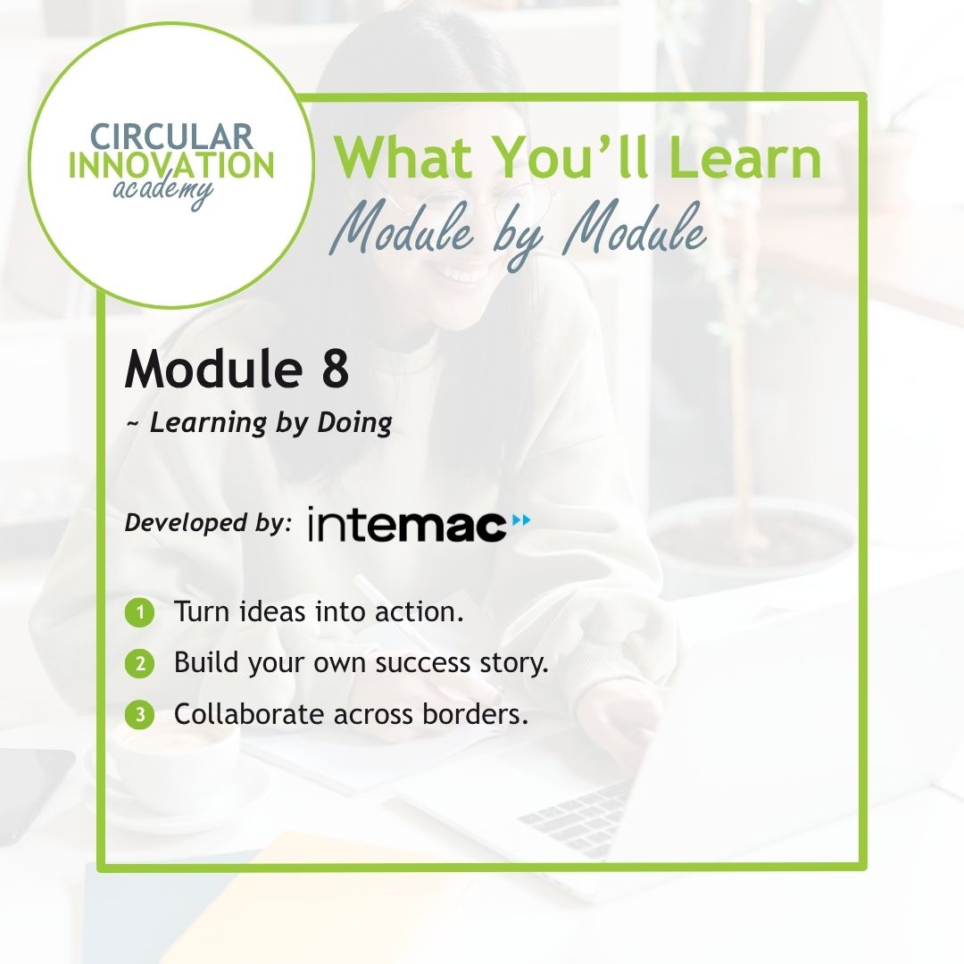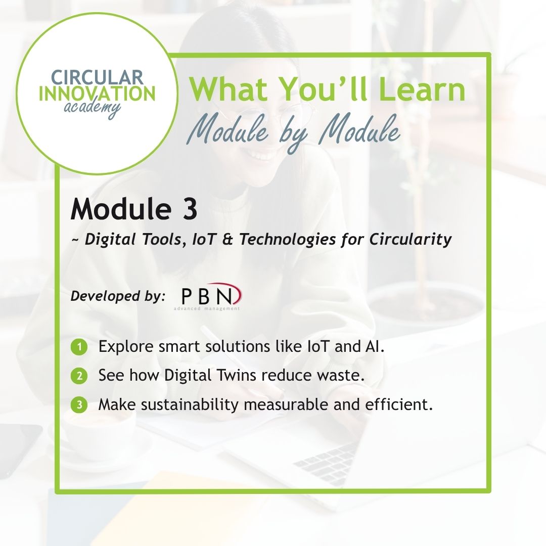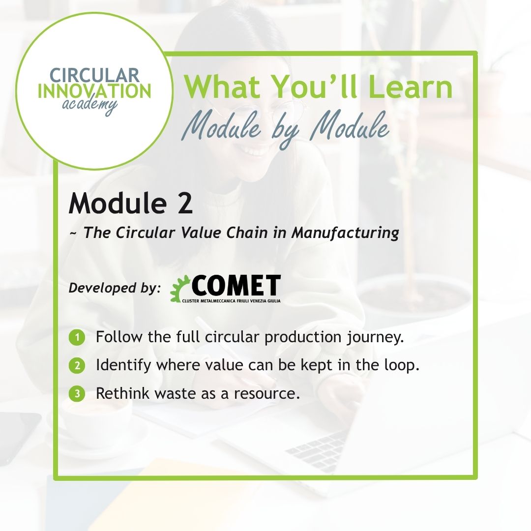 Circular Innovation Academy je kombinirana online platforma za učenje na engleskom jeziku osmišljena kako bi pružila praktična, sektorski specifična znanja o kružnom gospodarstvu kroz osam modula. Program povezuje tehničke i strateške aspekte s naglaskom na digitalne alate, pametnu proizvodnju i primijenjene inovacije.